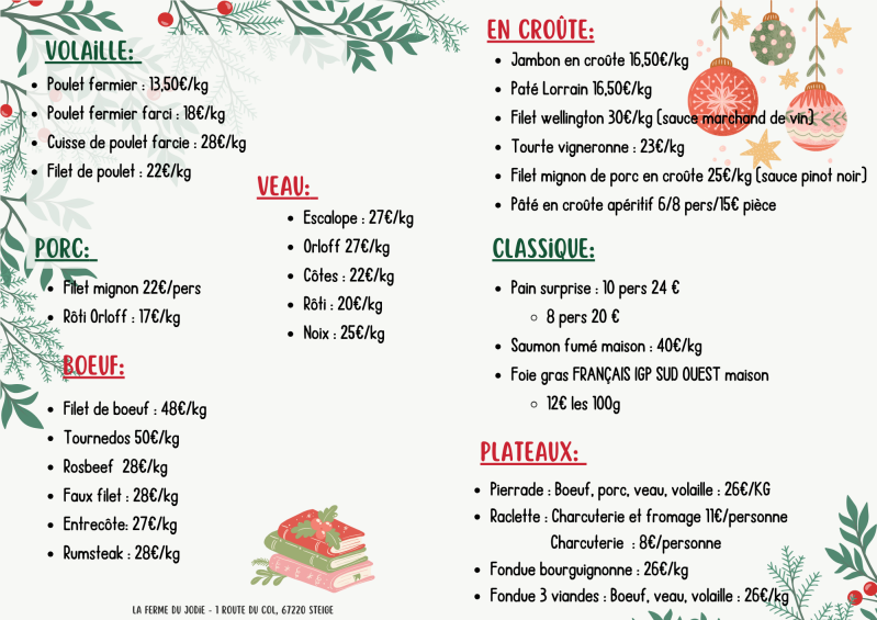 La Ferme du Jodie est une entreprise familiale située à STEIGE. Nous nous spécialisons dans la production et la vente directe de viande et de charcuteries fermières. Forts de notre expérience et de notre passion pour les produits fermiers, nous nous engageons à offrir à nos clients des produits de la plus haute qualité. Nos animaux sont élevés dans le respect des traditions et du bien-être animal. Notre équipe dévouée travaille avec soin pour proposer des produits authentiques et savoureux, du pré à votre assiette.